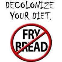 The slogan "Decolonize Your Diet" and the bumper stickers, pins, aprons, clocks, hats, etc. with the Anti-fry bread logo was created by me in 2000 and is at Cafe Press.
