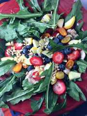 Dandilion greens, strawberries, blueberries, mushrooms, yellow squash, tomatoes and pinon pine nuts.