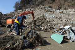 女川町の1次選別エリア。重機や手作業を併用して、がれきを材質や、大きさ別に大まかに分別していく