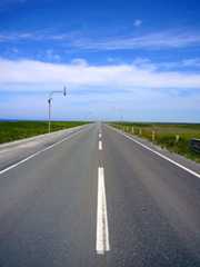 石狩から稚内まで日本海沿いを北へ向かう道は、通称「オロロンライン」と呼ばれ、海を眺めながらの爽快なドライブを楽しめます。天塩を過ぎて道道106号線に入ると、人工の建物はほとんど見えなくなり、何も遮るもののないどこまでも続くような直線道路を見ることができます。