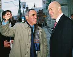 ![]() Гарри Каспаров и действующий чемпион мира Владимир Крамник на открытии суперматча по шахматам, 2001 год |