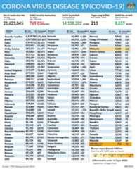 Kes COVID-19 dunia pada masa kini adalah sekitar 21.6 juta kes. Jumlah kes harian dunia menunjukkan penurunan iaitu 257,000 kes berbanding sebelumnya 286,000 kes.