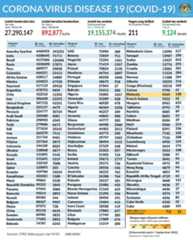 Kes COVID-19 pada masa kini adalah sekitar 27.3 juta kes. Jumlah kes harian dunia pada kali ini menunjukkan penurunan iaitu sekitar 219,000 berbanding sebelumnya 264,000 kes.