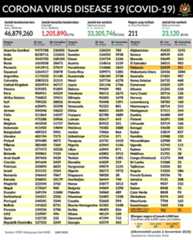 Jumlah kes dunia telah mencapai 46.9 juta dengan kes kematian 1.2 juta kes dan kesembuhan 33.3 juta kes.