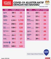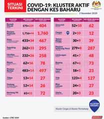 Secara keseluruhan 38 kluster aktif dilaporkan hari ini termasuk 2 kluster baharu. Kluster Rumah Merah hari ini mencatatkan kes tertinggi (299). Kluster ini dilaporkan pada 30 Oktober 2020 di Kota Kinabalu, Sabah dan merupakan sebuah Pusat Tahanan Sementara. Selain itu, kluster Penjara Kepayan, Kaya dan Saguking turut melaporkan kes melebihi angka 30.