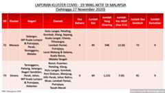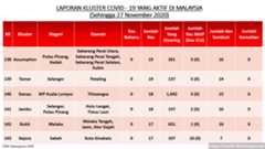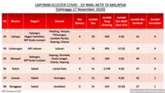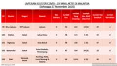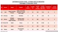 Setakat 27 Nov 2020, 349 kluster dilaporkan termasuk 4 hari ini. 173 telah ditamatkan, bermakna tinggal 176 kluster lagi yang masih aktif.