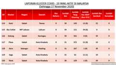 Sehingga 27 November 2020, terdapat sebanyak349 kluster telah dilaporkan termasukempat (4) kluster baharu yang dilaporkan pada hari ini. Jumlahkluster yang telah tamat pula adalah sebanyak 173 kluster dengan satu (1) kluster yang tamat pada hari ini iaitu Kluster Omadal. Ini menjadikan jumlah kluster aktif yang dipantau adalah sebanyak 176 kluster. Daripada jumlah tersebut, sebanyak47 kluster melaporkan pertambahan kes. Kluster-kluster yang melaporkan pertambahan kes baharu tertinggi pada hari ini adalahKluster Tapak Bina Puteh Lama (118 kes), Kluster Jalan Haruan (116 kes) dan Kluster Jalan Tuaran (43 kes).