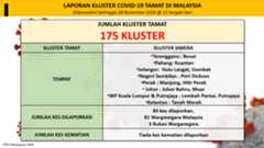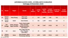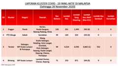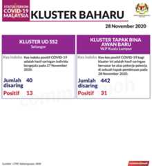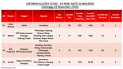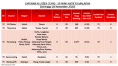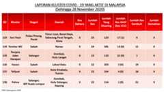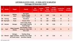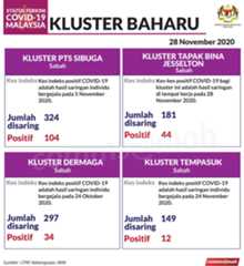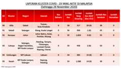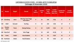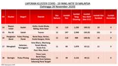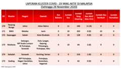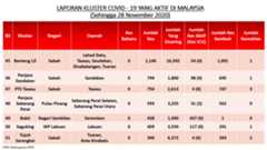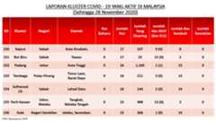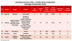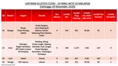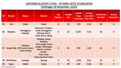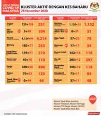 Sehingga 28 November 2020, terdapat sebanyak355 kluster telah dilaporkan termasukenam (6) kluster baharu yang dilaporkan pada hari ini. Jumlah kluster yang telah tamat pula adalah sebanyak175 kluster termasuk dua (2) kluster yang tamat pada hari ini iaituKluster Menara dan Kluster Simera. Ini menjadikan jumlah kluster aktif yang dipantau adalah sebanyak 180 kluster. Daripada jumlah tersebut, sebanyak44 kluster melaporkan pertambahan kes. Kluster-kluster yang melaporkan pertambahan kes baharu tertinggi pada hari ini adalahKluster Enggor (126 kes), Kluster Teratai (90 kes) dan Kluster Bintang (71 kes).