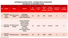 Sehingga 16 Disember 2020, terdapat sebanyak 426 kluster telah dilaporkan termasuklapan (8) kluster baharu pada hari ini. Jumlah kluster yang telah tamat pula adalah sebanyak230 kluster termasuk satu (1) kluster yang tamat pada hari ini iaituKluster Murni di Wilayah Persekutuan Kuala Lumpur dan Selangor. Ini menjadikan jumlah kluster aktif yang dipantau adalah sebanyak196 kluster. Daripada jumlah tersebut, sebanyak 51 kluster melaporkan pertambahan kes pada hari ini. Kluster-kluster yang melaporkan pertambahan kes baharu tertinggi adalahKluster Teratai (143 kes), Kluster Usaha (79 kes), dan Kluster Tapak Bina Jalan Stadium (63 kes).