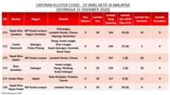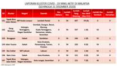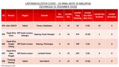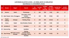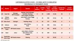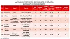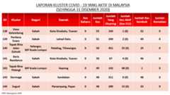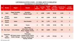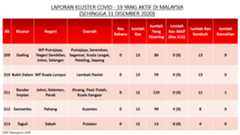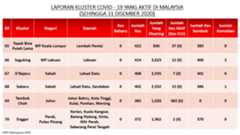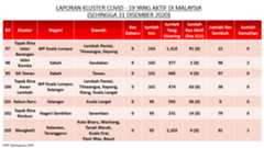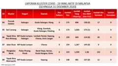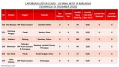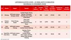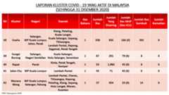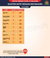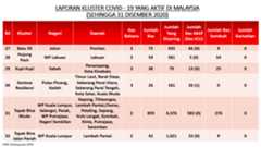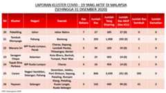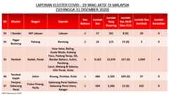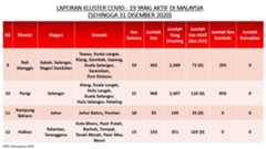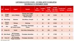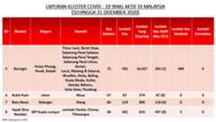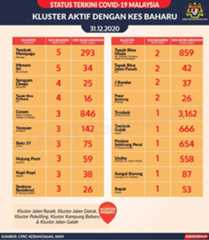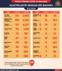 Sehingga 31 Disember 2020, terdapat sebanyak 511 kluster telah dilaporkan termasuklima (5) kluster baharu pada hari ini. Jumlah kluster yang telah tamat pula adalah sebanyak 286 kluster termasuk tiga (3) kluster yang tamat pada hari ini iaitu Kluster Teduh, Kluster Jaya dan Kluster Berendam. Ini menjadikan jumlah kluster aktif yang dipantau adalah sebanyak 225 kluster. Daripada jumlah tersebut, sebanyak 49 kluster melaporkan pertambahan kes pada hari ini. Kluster-kluster yang melaporkan pertambahan kes baharu tertinggi adalah Kluster Seruling (371 kes), Kluster Penjara Jalan Harapan (285 kes), dan Kluster Teratai (151 kes).