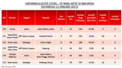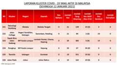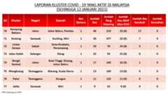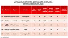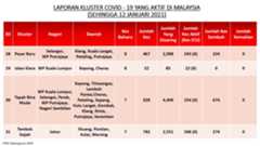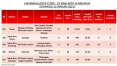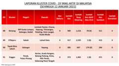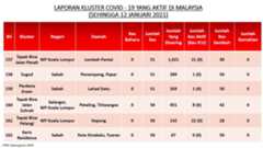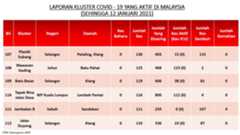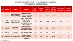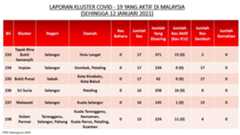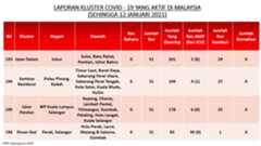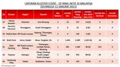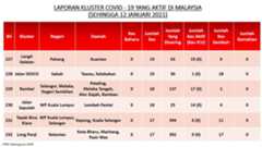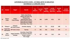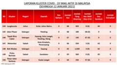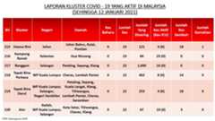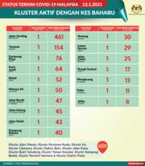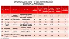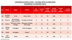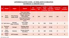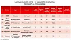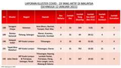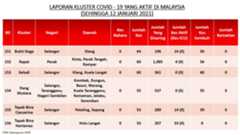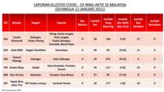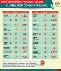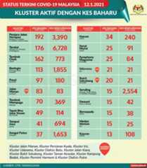 Sehingga 12 Januari 2021, terdapat sebanyak605 kluster telah dilaporkan termasuk11 kluster baharu pada hari ini. Jumlah kluster yang telah tamat pula adalah sebanyak344 kluster, termasuk lapan (8) kluster yang tamat pada hari ini iaituKluster Atabara,Kluster Senu Setia,Kluster Bonggaya,Kluster Jernai,Kluster Pengkalan Barat,Kluster Tapak Bina Puteh Lama,Kluster Tapak Bina Jalan Bukit, danKluster Sabaru. Ini menjadikan jumlah kluster aktif yang dipantau adalah sebanyak261 kluster. Daripada jumlah tersebut, sebanyak77 kluster melaporkan pertambahan kes pada hari ini. Kluster-kluster yang melaporkan pertambahan kes baharu tertinggi adalahKluster Penjara Jalan Harapan (192 kes), Kluster Teratai (176 kes), dan Kluster Tembok Choh (162 kes)
