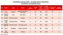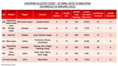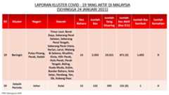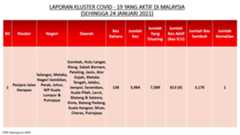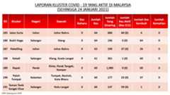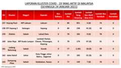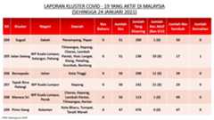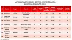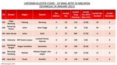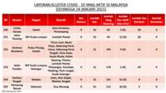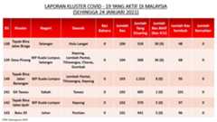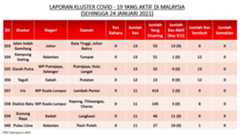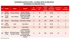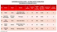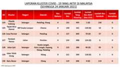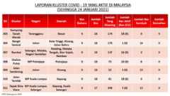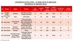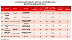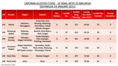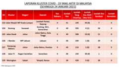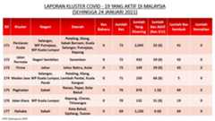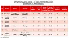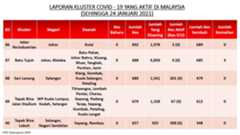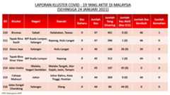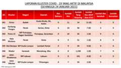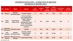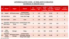 Berikut adalah maklumat terkini berkaitan kluster-kluster di Malaysia sehingga 24 Januari 2021;
