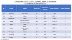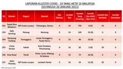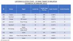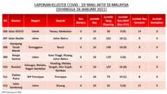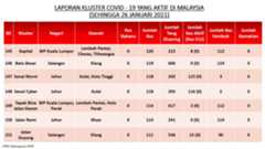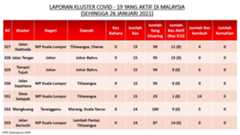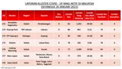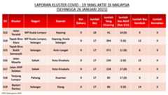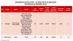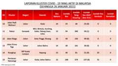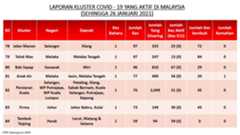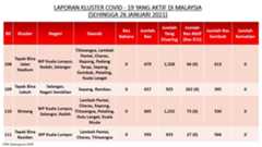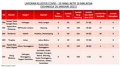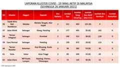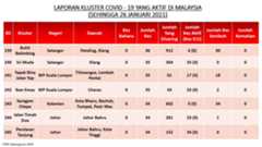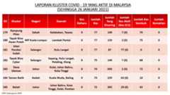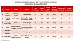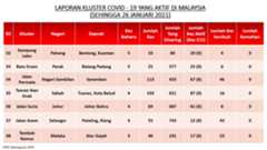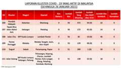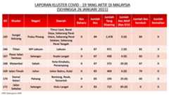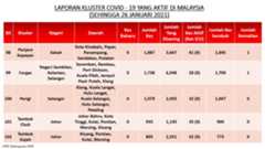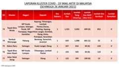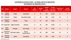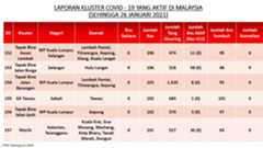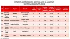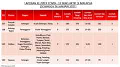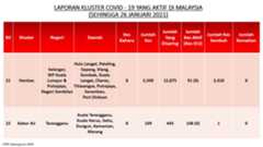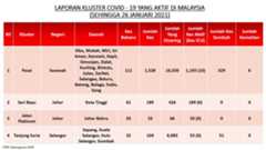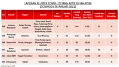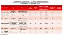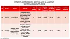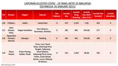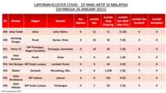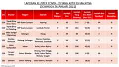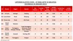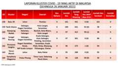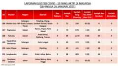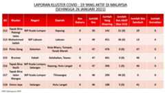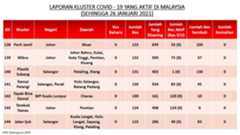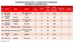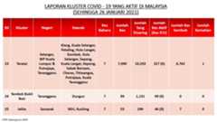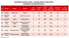 Berikut adalah maklumat terkini berkaitan kluster-kluster di Malaysia sehingga 26 Januari 2021;