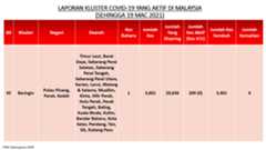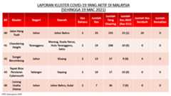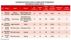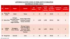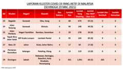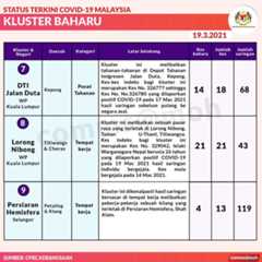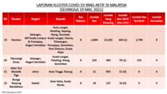 Berikut adalah maklumat terkini berkaitan kluster-kluster di Malaysia sehingga 19 Mac 2021:
