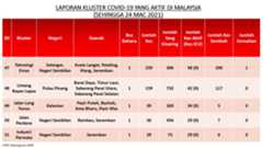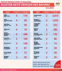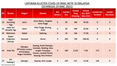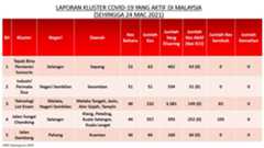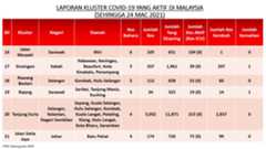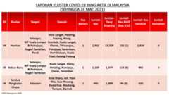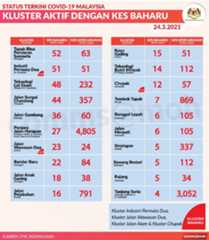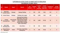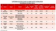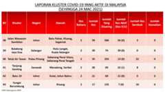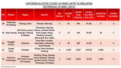 Berikut adalah maklumat terkini berkaitan kluster-kluster di Malaysia sehingga 24 Mac 2021: