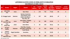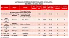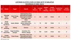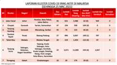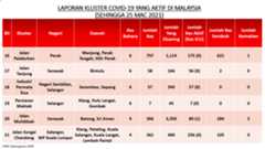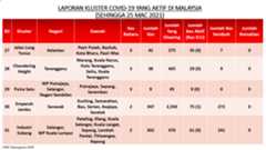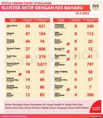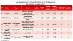 Berikut adalah maklumat terkini berkaitan kluster-kluster di Malaysia sehingga 25 Mac 2021: