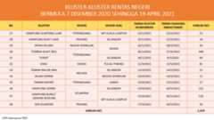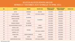 Berikut adalah maklumat terkini berkaitan kluster-kluster di Malaysia sehingga 19 April 2021: