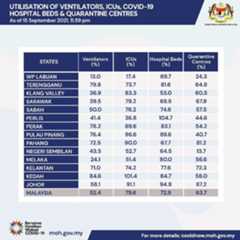 Status terkini Kapasiti & Penggunaan Katil COVID-19, Pemberian Vaksin & Kes Baharu Sehingga 15 September 2021:
