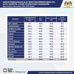 - Kes yang memerlukan rawatan di Unit Rawatan Rapi (ICU) :555 kes (519 kes disahkan COVID-19 ; 36 kes disyaki, kemungkinan, dan kes dalam siasatan) ;