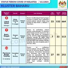 Berikut adalah maklumat terkini berkaitan kluster-kluster di Malaysia sehingga 13 Februari 2021;