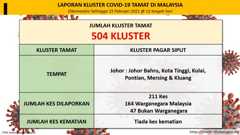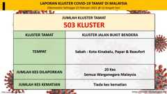 Jumlah kluster yang telah tamat : 507 kluster (termasuk lapan (8) kluster yang tamat pada hari ini iaitu Kluster Jalan Sibuga, Kluster Taman Tasik Sungai Chua, Kluster Jalan Bukit Bendera, Kluster Lumut Barat, Kluster Pagar Siput, Kluster Kampung Renok, Kluster Sungai Redan, dan Kluster Bah Manggis;