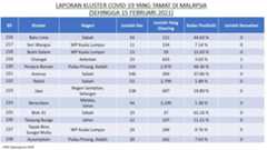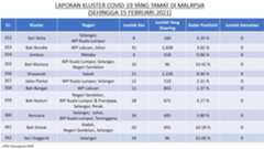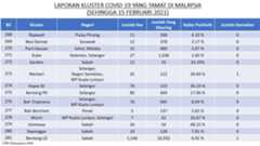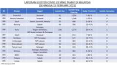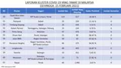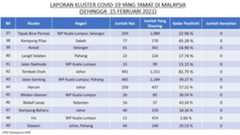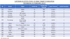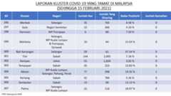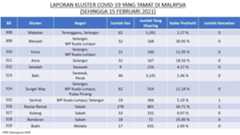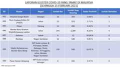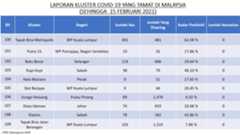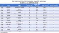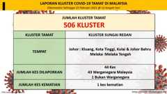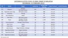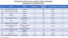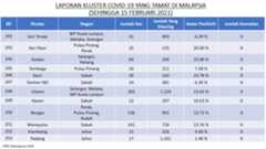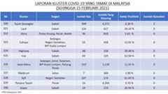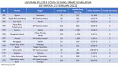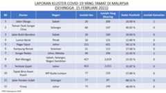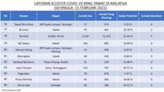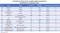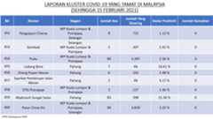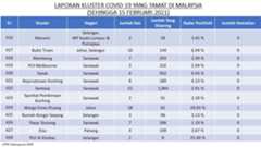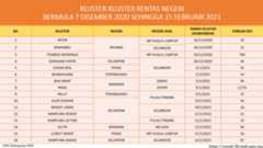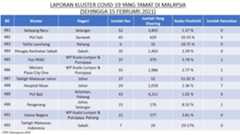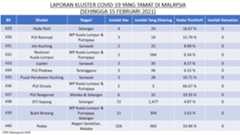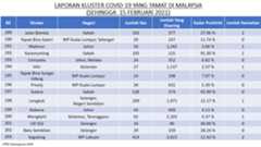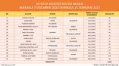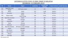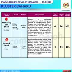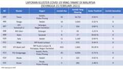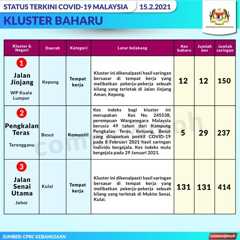 Berikut adalah maklumat terkini berkaitan kluster-kluster di Malaysia sehingga 15 Februari 2021: