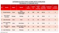 Berikut adalah maklumat terkini berkaitan kluster-kluster di Malaysia sehingga 21 Februari 2021: