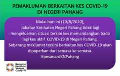 - Jumlah kes aktif dengan kebolehjangkitan COVID-19: 1