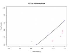 Functions are provided to create useful plots. For instance, it isilluminating to plot the posterior means of the probabilities ofefficacy and toxicity at each of the doses on the trade-off contoursused to measure dose attractiveness. The five doses are shown in red.Doses closer to the lower-right corner have higher utility.