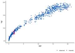 # impute the incomplete dataimp<-mice(dat,m =1,seed =1)# visualize the imputed dataggmice(imp,aes(age, hgt))+geom_point()