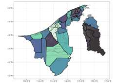 # Load librarieslibrary(tidyverse)theme_set(theme_bw())library(bruneimap)library(sf)# What's in our data set?glimpse(kpg_sf)#> Rows: 438#> Columns: 9#> $ id <dbl> 1, 2, 3, 4, 5, 6, 7, 8, 9, 10, 11, 12, 13, 14, 15, 16, 17, 1…#> $ kampong <chr> "Kg. Biang", "Kg. Amo", "Kg. Sibut", "Kg. Sumbiling Baru", "…#> $ mukim <chr> "Mukim Amo", "Mukim Amo", "Mukim Amo", "Mukim Amo", "Mukim A…#> $ district <chr> "Temburong", "Temburong", "Temburong", "Temburong", "Temburo…#> $ geometry <POLYGON [°]> POLYGON ((115.1546 4.66665,..., POLYGON ((115.1626 4…#> $ X <dbl> 115.1244, 115.1512, 115.1080, 115.1071, 115.1600, 115.1247, …#> $ Y <dbl> 4.666180, 4.631506, 4.611763, 4.597677, 4.574173, 4.587969, …#> $ perimeter [m] 21056.211 [m], 38683.611 [m], 16291.051 [m], 12994.328 [m], 33…#> $ area [m^2] 19281117.5 [m^2], 52037879.4 [m^2], 7597654.2 [m^2], 6652565…ggplot(kpg_sf)+geom_sf(aes(fill = mukim),col ="gray50",alpha =0.8)+geom_sf(data = mkm_sf,col ="black",lwd =0.5,fill =NA)+geom_sf(data = dplyr::filter(kpg_sf,is.na(mukim)),fill ="gray70",col ="gray70")+theme(legend.position ="none")+scale_fill_viridis_d(option ="mako")