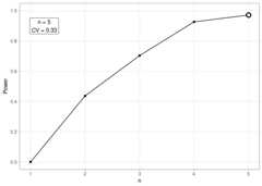 cboCost<-sim_cbo(betaResult,cn =75)cboCost#> Sampling designs that meet the required power:#> n Power Cost Suggested#> 2 0.4366667 150#> 3 0.7033333 225#> 4 0.9266667 300#> 5 0.9716194 375 ***#>#> The listed cost is per treatment.# This plot will look different in every simulationplot_power(data = betaResult,n =NULL,method ="power")