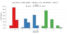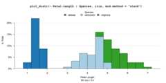 The problem when it comes to distributions is that we often face avariety of data, each requiring a different type of layout: we don’trepresent the distribution of categorical variables similarly tocontinuous variables, and regarding the latter heavily skewed data mayrequire a special treatment. The aim offplot is toautomatically make choices for the user in order to always displaymeaningful (and hopefully beautiful!) graphs.