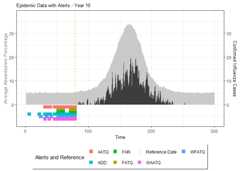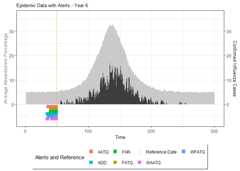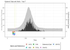 # Summarize alarm metricssummary(alarm_metrics$results)#> Alarm Metrics Summary#> =====================#>#> FAR :#> Mean: 0.5603#> Variance: 0.0191#> Best lag: 9#> Best threshold: 0.1#> Best value: 0.2111#>#> ADD :#> Mean: 25.831#> Variance: 75.0129#> Best lag: 1#> Best threshold: 0.1#> Best value: 6.1111#>#> AATQ :#> Mean: 0.542#> Variance: 0.028#> Best lag: 2#> Best threshold: 0.1#> Best value: 0.1861#>#> FATQ :#> Mean: 0.5451#> Variance: 0.0228#> Best lag: 9#> Best threshold: 0.1#> Best value: 0.1964#>#> WAATQ :#> Mean: 0.5288#> Variance: 0.0313#> Best lag: 1#> Best threshold: 0.15#> Best value: 0.1373#>#> WFATQ :#> Mean: 0.5474#> Variance: 0.0217#> Best lag: 4#> Best threshold: 0.1#> Best value: 0.2516#>#> Reference Dates:#> epidemic_years ref_dates#> 1 1 53#> 2 2 64#> 3 3 43#> 4 4 61#> 5 5 45#> 6 6 49#> 7 7 40#> 8 8 48#> 9 9 61#> 10 10 79#>#> Best Prediction Dates:#> FAR :#> [1] NA 50 42 54 45 40 31 NA 55 52#>#> ADD :#> [1] NA 47 NA 43 24 35 31 26 33 6#>#> AATQ :#> [1] NA 47 NA 46 30 36 30 32 37 31#>#> FATQ :#> [1] NA 50 42 54 45 40 31 NA 55 52#>#> WAATQ :#> [1] NA 48 NA 43 24 35 37 26 37 31#>#> WFATQ :#> [1] NA 46 NA 52 33 37 31 41 55 24# Generate and display plots for alarm metrics across epidemic yearsalarm_plots<-plot(alarm_metrics$plot_data)for(iinseq_along(alarm_plots)) {print(alarm_plots[[i]])}