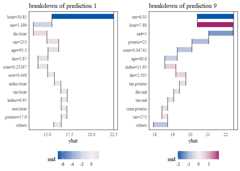 # visualize the MID breakdown of the model predictionsbd1<-mid.breakdown(mid,data = train,row = 1L)bd9<-mid.breakdown(mid,data = train,row = 9L)grid.arrange(nrow = 1L,ggmid(bd1,"waterfall",theme ="midr",max.nterms = 14L)+theme(legend.position ="bottom")+ggtitle("breakdown of prediction 1"),ggmid(bd9,"waterfall",theme ="midr",max.nterms = 14L)+theme(legend.position ="bottom")+ggtitle("breakdown of prediction 9"))