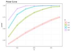 set.seed(01123581321)# estimate the require n value to achieve a power of 1 - beta = .95p_t.test(n=NA,d=0.5)|>Spower(power=.95,interval=c(50,300))## Iter: 56; Median = 101; E(f(x)) = 0.00; Total.reps = 11000; k.tol = 2; Pred = 103.4#### Execution time (H:M:S): 00:00:05## Design conditions:#### # A tibble: 1 × 4## n d sig.level power## <dbl> <dbl> <dbl> <dbl>## 1 NA 0.5 0.05 0.95#### Estimate of n: 103.4## 95% Predicted Confidence Interval: [101.5, 105.4]To generate suitable power-curves for any given simulation or poweranalysis criteria, the simulation experiment can be passed toSpowerCurve() (or toSpowerBatch() first, andthen toSpowerCurve()). This function contains a similarspecification structure toSpower(), however differs inthat the arguments to vary are explicitly passed as named vectors toSpowerCurve(). Below is an example varying sample size(n), while the next example varies bothn andthe effect sized.