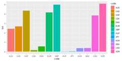 # install.packages("devtools")devtools::install_github("szymanskir/rnbp")library(rnbp)library(ggplot2)## Retrieve current C exchange rate tableresponse<-get_current_exchangerate_table("C")## Retrieve content from the responsecurrent_exchangerate_table<- response$content$rates[[1]]ggplot(current_exchangerate_table,aes(x = code,y = bid,fill = code))+geom_bar(stat ="identity")
