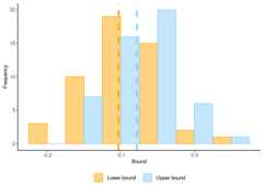 head(r$bounds.bootstrap)#> lower upper#> 1 -0.176726565 -0.13140944#> 2 -0.079414585 -0.04838939#> 3 -0.004379649 0.01163401#> 4 -0.126917750 -0.09350509#> 5 -0.110911453 -0.09289715#> 6 -0.101183496 -0.08202556The dashed lines in the figure below indicate the bounds obtainedfrom the original sample.