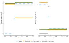 ## Target weightsw1<-cbind(r$gstar.weights$w1$lb, r$gstar.weights$w1$ub, r$gstar.weights$w1$multiplier)## IV-like estimand weightssw1<-cbind(r$s.set$s1$w1$lb, r$s.set$s1$w1$ub, r$s.set$s1$w1$multiplier)sw2<-cbind(r$s.set$s2$w1$lb, r$s.set$s2$w1$ub, r$s.set$s2$w1$multiplier)sw3<-cbind(r$s.set$s3$w1$lb, r$s.set$s3$w1$ub, r$s.set$s3$w1$multiplier)sw4<-cbind(r$s.set$s4$w1$lb, r$s.set$s4$w1$ub, r$s.set$s4$w1$multiplier)## Assign column namescolnames(w1)<-colnames(sw1)<-colnames(sw2)<-colnames(sw3)<-colnames(sw4)<-c("lb","ub","mp")Since the propensity score model is simplymorekids ~ samesex, andsamesex is a binaryvariable, there are only two values of the propensity score. These twovalues partition the unit interval into three regions, and the averageweights will vary across these three regions. These propensity scorescan be recovered from the columnub in any of the matricesconstructed above.