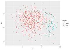 minority=data.frame(x1 =rnorm(50,15,2),x2 =rnorm(50,25,10),target ="true")majority=data.frame(x1 =rnorm(500,5,4),x2 =rnorm(500,30,10),target ="false")dataset=rbind(minority, majority)ggplot(dataset)+geom_point(aes(x1, x2,color = target))