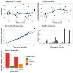 # Work with statistical model objectsm<-lm(disp~ mpg+ hp+ cyl+ mpg:cyl, mtcars)accuracy(m)#> AIC BIC R2 R2_adj MAE MAPE RMSE#> 1 344.64 353.43 0.87 0.85 34.9 15.73% 43.75plot_model(m)