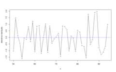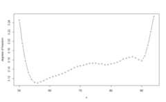 print function provides a glimpse of the fittedresultsWH_1d_fitAn object fitted using the WHfunctionInitial data contains45 data points: Observation positions:50 to94Smoothing parameter selected:9327Associated degrees of freedom:6.8WH_2d_fitAn object fitted using the WHfunctionInitial data contains450 data points: First dimension:70 to99 Second dimension:0 to14Smoothing parameters selected:1211.41.1Associated degrees of freedom:47plot function generates rough plots of the modelfit, the associated standard deviation, the model residuals or theassociated degrees of freedom. See theplot.WH_1d andplot.WH_2d functions help for more details.plot(WH_1d_fit)