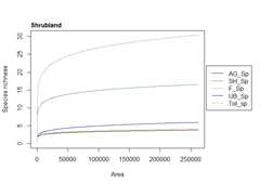 s3<-sar_countryside(data = countryside,modType ="power",gridStart ="none",habNam =c("AG","SH","F"),spNam =c("AG_Sp","SH_Sp","F_Sp","UB_Sp"))par(mar=c(5.1,4.1,4.1,7.5),xpd=TRUE)plot(s3,type =2,totSp =TRUE,lcol =c("black","aquamarine4","#CC661AB3" ,"darkblue","darkgrey"),pLeg =TRUE,legPos ="topright",legInset =c(-0.27,0.3),lwd =1.5,ModTitle =c("Agricultural land","Shrubland","Forest"),which =2)