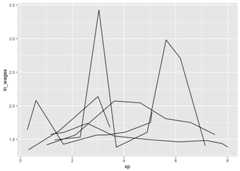 set.seed(2019-7-15-1300)wages%>%sample_n_keys(size =5)%>%ggplot(aes(x = xp,y = ln_wages,group = id))+geom_line()