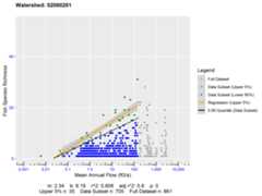 library(elfgen)# Retrieve dataset of interest# You may enter either a 6, 8, 10, or 12-digit HUC code# *Notes:# By default the ichthy dataset is downloaded to a temp directory, however this may be overridden by# supplying a local path of interest using the input parameter "ichthy.localpath"# 6-digit HUCs like the following example may take a few minutes to process with elfdata() due to the# large number of contained IchthyMaps historical stream fish distribution datawatershed.df<-elfdata(watershed.code ='02080201',ichthy.localpath =tempdir())# Alternatively, utilize a user-supplied dataset in the following format:watershed.df<-data.frame(flow=c(28.257,20.254,22.825, ...),richness=c(2,10,12, ...),watershed='02080201',stringsAsFactors=FALSE)"quantile" forisolating an upper subset of the data. A user also identifies a boundingrange between two x-values ("blo" = “bound low”,"bhi" = “bound high”) in which the upper subest of data isbelieved to contain a breakpoint. (Note: Small datasets may not containa breakpoint)# Fixed Methodbreakpt<-500# Piecewise Iterative Methodbreakpt<-bkpt_pwit("watershed.df"= watershed.df,"quantile"=0.95,"blo"=200,"bhi"=500)#> [1] "Breakpoint identified at 310.815"# Ymax Methodbreakpt<-bkpt_ymax("watershed.df"= watershed.df)#> [1] "Breakpoint identified at 142.989""quantile" for isolating the uppersubset of the data. The breakpoint"breakpt" determinedusing one of the above methods is passed in."yaxis_thresh"is used to customize the maximum y-axis limit. Custom x-axis and y-axisplot labels can be specified using"xlabel" and"ylabel" respectively.elf<-elfgen("watershed.df"= watershed.df,"quantile"=0.95,"breakpt"= breakpt,"yaxis_thresh"=53,"xlabel"="Mean Annual Flow (ft3/s)","ylabel"="Fish Species Richness")elf$plot