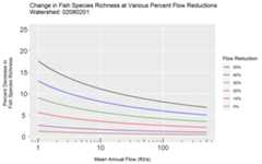 elf$stats#> watershed breakpt quantile m b rsquared rsquared_adj p n_total n_subset n_subset_upper#> 1 02080201 142.989 0.95 2.34 9.19 0.806 0.8 0 861 705 35richness_change() and input the percent reduction in flow"pctchg" (10 = 10% reduction in flow)"xval"parameter is supplied, the function will calculate the percent change inrichness at a specific stream size (For this example 50 = a stream sizewith mean annual flow of 50 cfs)# Calculate absolute richness change (resulting from flow reduction)richness_change(elf$stats,"pctchg"=10)#> [1] "Absolute Richness Change:"#> [1] -0.2465436# Calculate percent richness change at a specific stream sizerichness_change(elf$stats,"pctchg"=10,"xval"=50)#> [1] "Percent Richness Change at x = 50:"#> [1] -1.343992elfchange()."yaxis_thresh" is used tocustomize the maximum y-axis limit. Custom x-axis and y-axis plot labelscan be specified using"xlabel" and"ylabel"respectively.# Generate plot of percent richness change for various percent flow reductionselfchange(elf$stats,"yaxis_thresh"=25)