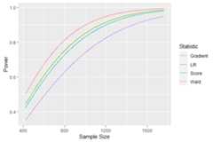 res<-irtpwr(hyp = hyp,power =0.8,alpha =0.05)summary(res)#>#> Sample sizes for power = 0.8 (alpha = 0.05):#>#> Statistic N#> Wald 1134#> LR 887#> Score 932#> Gradient 778#>#> Method: AnalyticalHere we see that the gradient statistic would be the most efficientto test our hypothesis: We would need a sample size of 778 to reach ourdesired power.