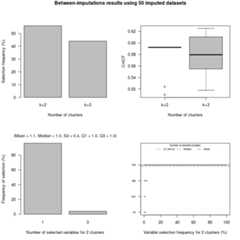 miclustThis package performs cluster analysis with selection of the finalnumber of clusters and an optional variable selection procedure. Thepackage is designed to integrate the results of multiple imputation todeal with missing raw data while accounting for the uncertainty thatsuch imputations introduce in the final results.