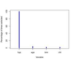 y<-getvariablesfrequency(minhanes1clust)y#> $percfreq#> [1] 100 4 2 2#>#> $varnames#> [1] "hyp" "age" "bmi" "chl"plot(y$percfreq,type ="h",main ="",xlab ="Variable",ylab ="Percentage of times selected",xlim =0.5+c(0,length(y$varnames)),lwd =5,col ="blue",xaxt ="n")axis(1,at =1:length(y$varnames),labels = y$varnames)