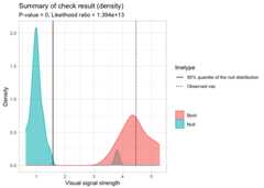 checker$check(null_draws = 20L,boot_draws = 20L)#> ✔ Generate null data.#> ✔ Generate null plots.#> ✔ Compute auxilary inputs.#> ✔ Predict visual signal strength for 20 images.#> ✔ Generate bootstrapped data.#> ✔ Generate bootstrapped plots.#> ✔ Compute auxilary inputs.#> ✔ Predict visual signal strength for 20 images.#> ✔ Predict visual signal strength for 1 image.The check result is stored in thecheck_resultattribute. If you print thechecker object, it will show abrief summary of the result.